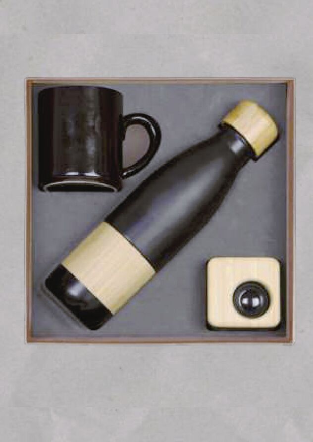 ANTOINE Coffret écologique 3 pièces et responsable, fabriqué avec des matières naturelles mais aussi divers matériaux recyclés (carton et carton recyclé). Ce coffret contient 3 pièces: un thermos élégant avec finition bambou, un haut parleur bambou et un mug noir en céramique.